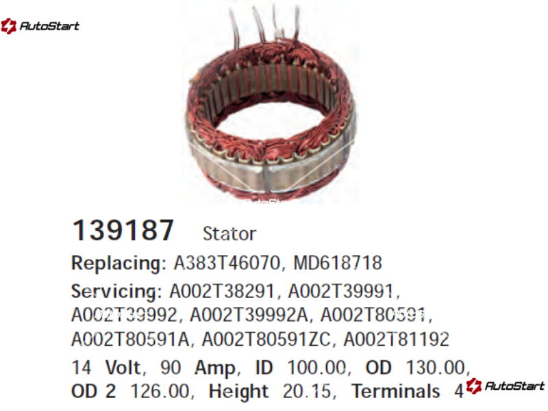 • Опис: Статор (обмотка) генератора 14В 90A 4 виводи CARGO F032139187
