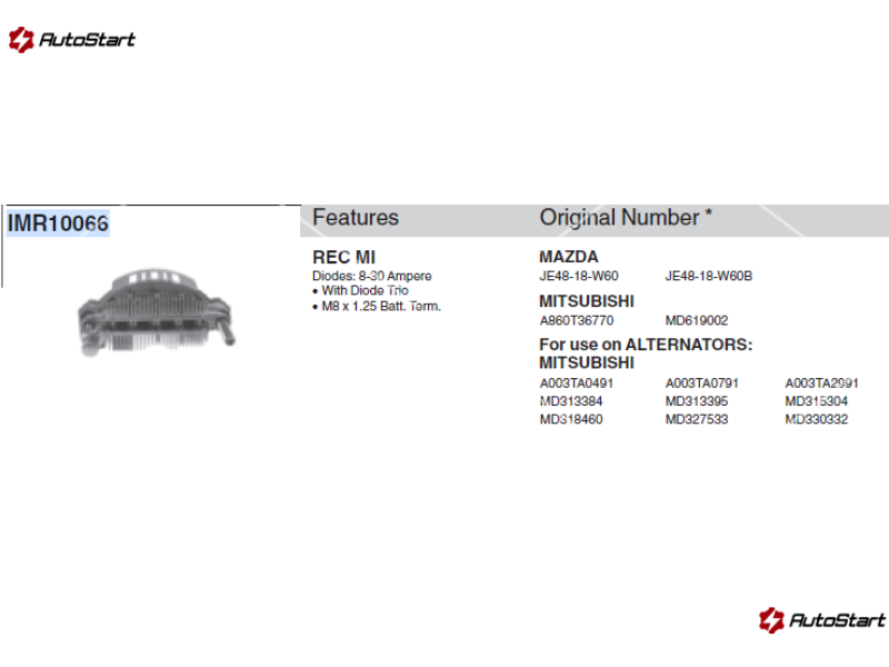 • Опис: Дiодний мiст генератора TRANSPO TRIMR10066 до IR/IF гегнераторів MITSUBISHI 90-110A для MAZDA